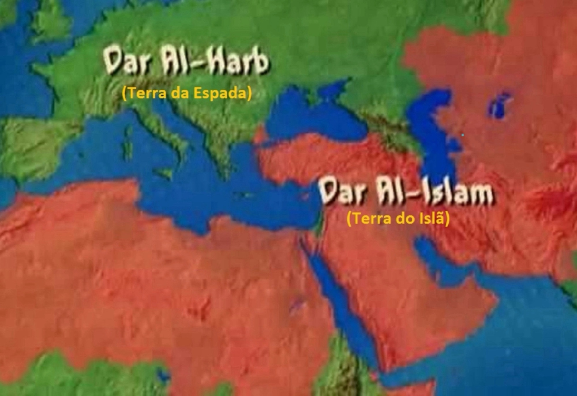 Isso captura sucintamente a ideia islâmica venerável de que o mundo é dividido em duas regiões, “A Terra do Islã” (Dar al-Islam) e a “Terra da Espada” (Dar al-Harb).