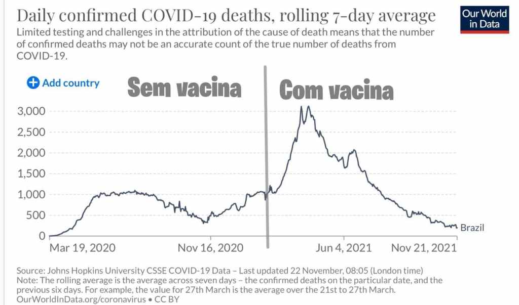 Em 21 de novembro de 2021, a posição da média de óbitos por Covid no Brasil, está bastante baixa, como pode ser visto no gráfico abaixo, retirado do site “Our World In Data”, que pode ser acessado por este link.