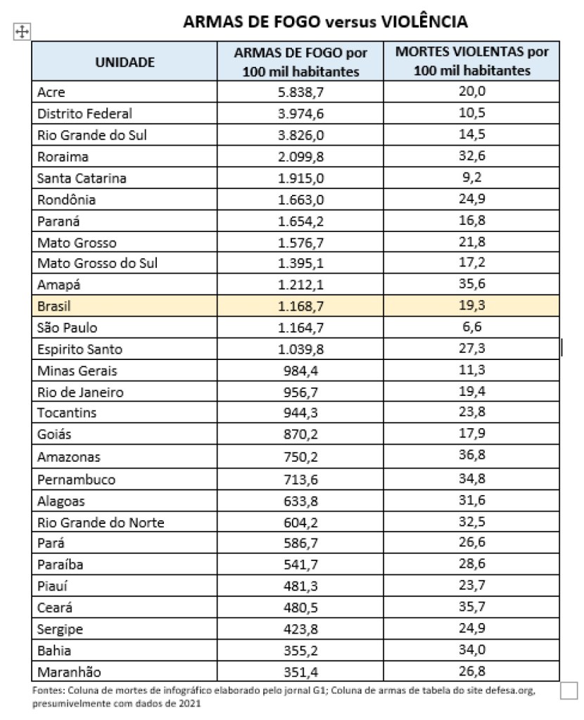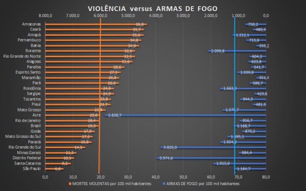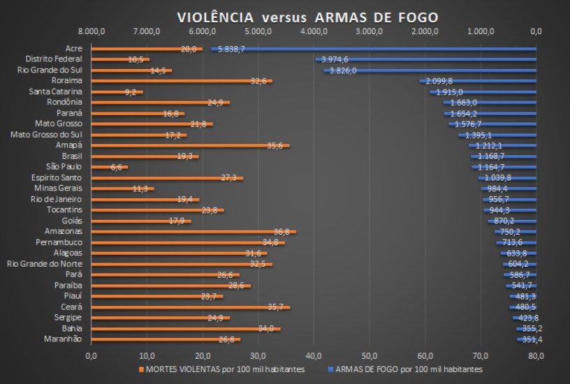 Os estados com mais armas registradas por 100 mil habitantes (Acre, Distrito Federal, Rio Grande do Sul, Roraima, Santa Catarina, Rondônia, Paraná, Mato Grosso, Mato Grosso do Sul e Amapá) estão abaixo da média de mortes violentas do Brasil.