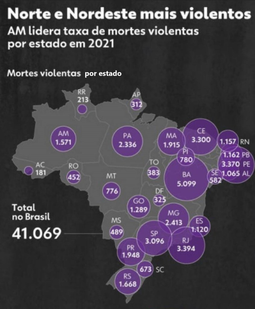 Dos 20 estados que estão com a média de mortes violentas acima da média geral do Brasil, 13 pertencem às regiões norte e nordeste (Amazonas, Ceará, Amapá, Pernambuco, Bahia, Roraima, Rio Grande do Norte, Alagoas, Paraíba, Maranhão, Pará, Piauí e Acre)