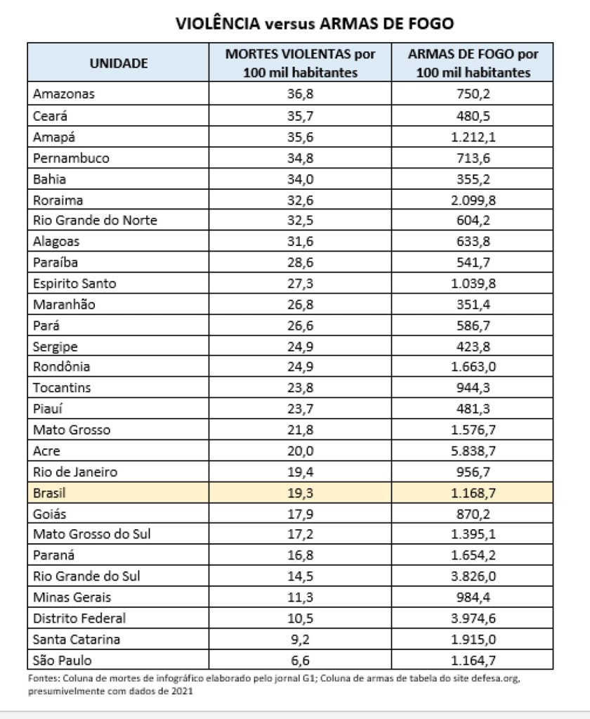 Aliás, estão abaixo da média de mortes vários estados com mais armas (Mato Grosso, Paraná, Rio Grande do Sul, Distrito Federal e Santa Catarina), tendo entrado na lista apenas Goiás, Minas Gerais e São Paulo).