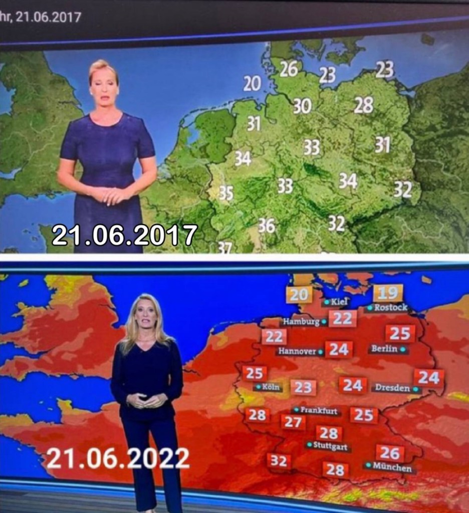 Por exemplo, a moça do tempo da TV alemã apresentou o mapa com as cores da temperatura mais avermelhadas em 2022 do que em 2017, embora elas não estivessem tão diferentes, como mostra a imagem abaixo.