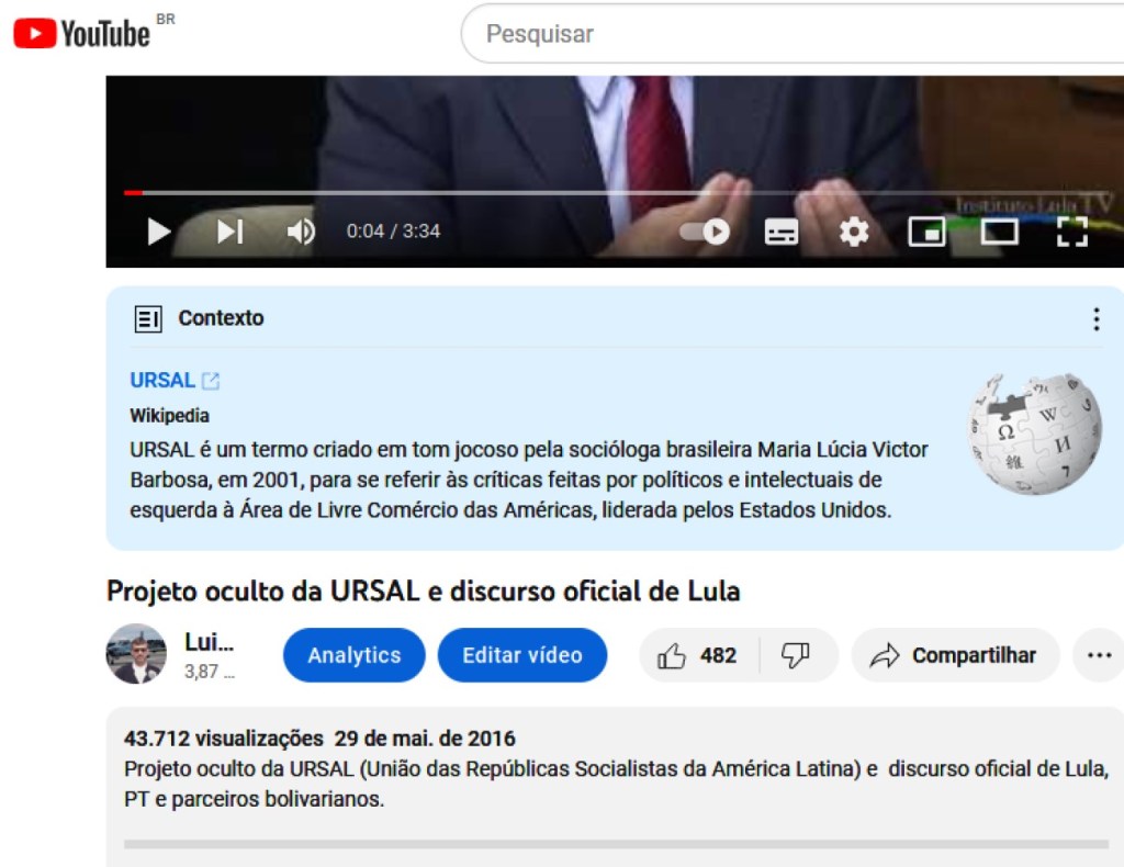 Há tempos publiquei no Youtube a fala do Lula sobre a governança única da América Latina e agora vi que a plataforma colocou um aviso informando que a “URSAL é um termo criado em tom jocoso pela socióloga brasileira Maria Lúcia Victor Barbosa, em 2001, para se referir às críticas feitas por políticos e intelectuais de esquerda à Área de Livre Comércio das Américas, liderada pelos Estados Unidos.”