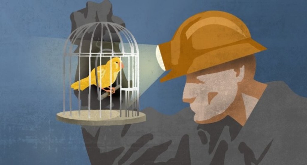 A referência ao “canário na mina de carvão” é porque antigamente os mineiros levavam canários nas minas, pois eles morriam logo na presença de gás venenoso, dando tempo aos mineiros de saírem da mina.