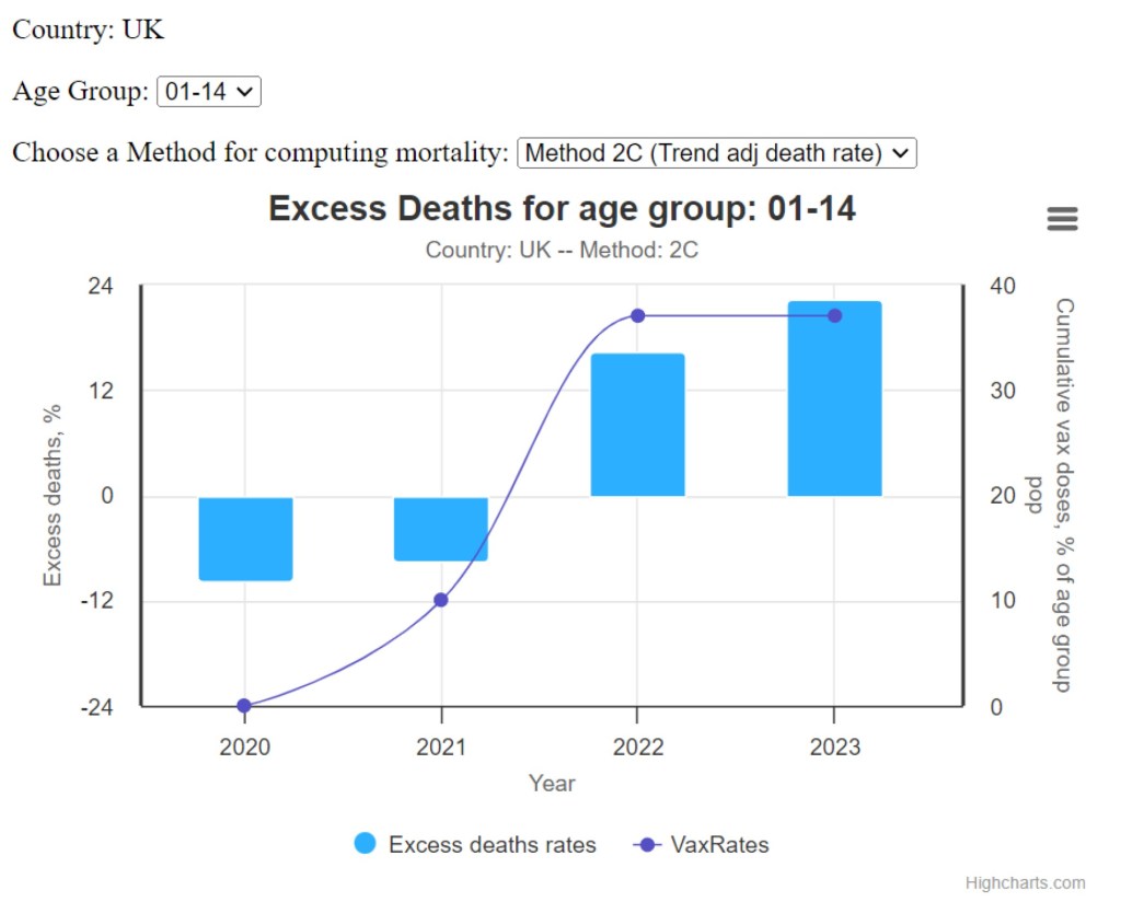 Essas taxas mudaram drasticamente para 16% mais mortes do que o previsto em 2022 e uma projeção de 22% mais mortes do que o previsto em 2023. Dowd culpou esse aumento na mortalidade no lançamento da vacina contra a COVID-19 para essa faixa etária, que começou em setembro de 2021, para jovens de 12 a 15 anos e abril de 2022 para crianças de 5 a 11 anos.