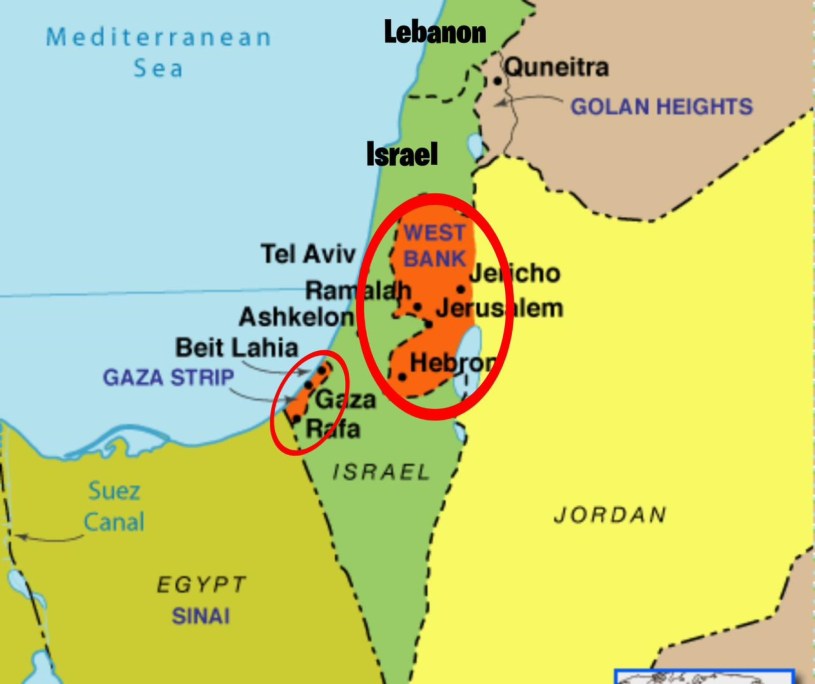 Bem, agora vamos ver como está a evolução da população da chamada “Palestina”, composta pelos territórios da “Faixa de Gaza” e da “Cisjordânia”, realçadas no mapa acima por elipses vermelhas.