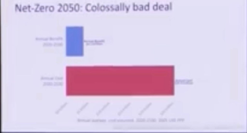 Mas o que eles não lhe dizem é que o custo será de cerca de 25 trilhões de dólares por ano. Isso significa que é um negócio incrivelmente ruim. Cada dólar gasto retornará 0,16 dólares por dólar. Essa é uma ideia terrível.
