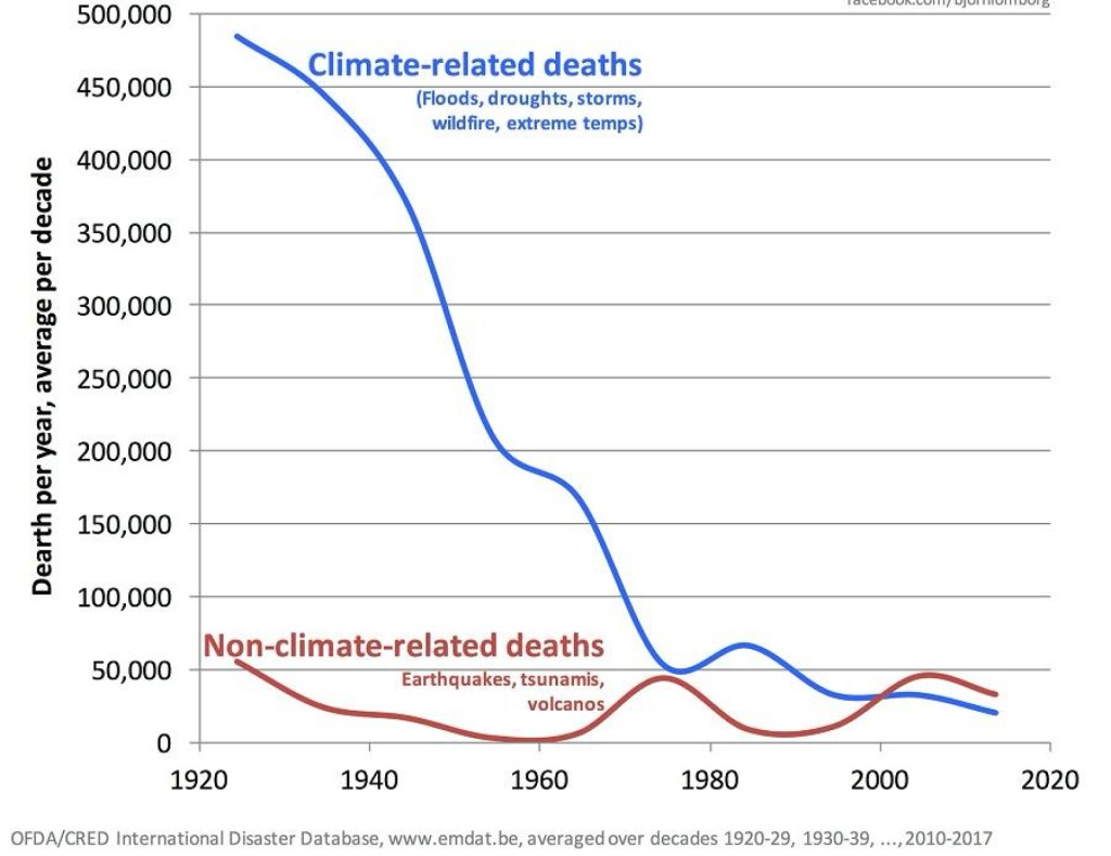 Se olharmos, por exemplo, as mortes causadas pela mudança climática, que poderiam ser mortes relacionadas ao clima como enchentes, secas, tempestades e incêndios florestais. Eles não estão nos matando mais. Na verdade, há 100 anos, na década de 1920, elas mataram cerca de 500.000 pessoas.