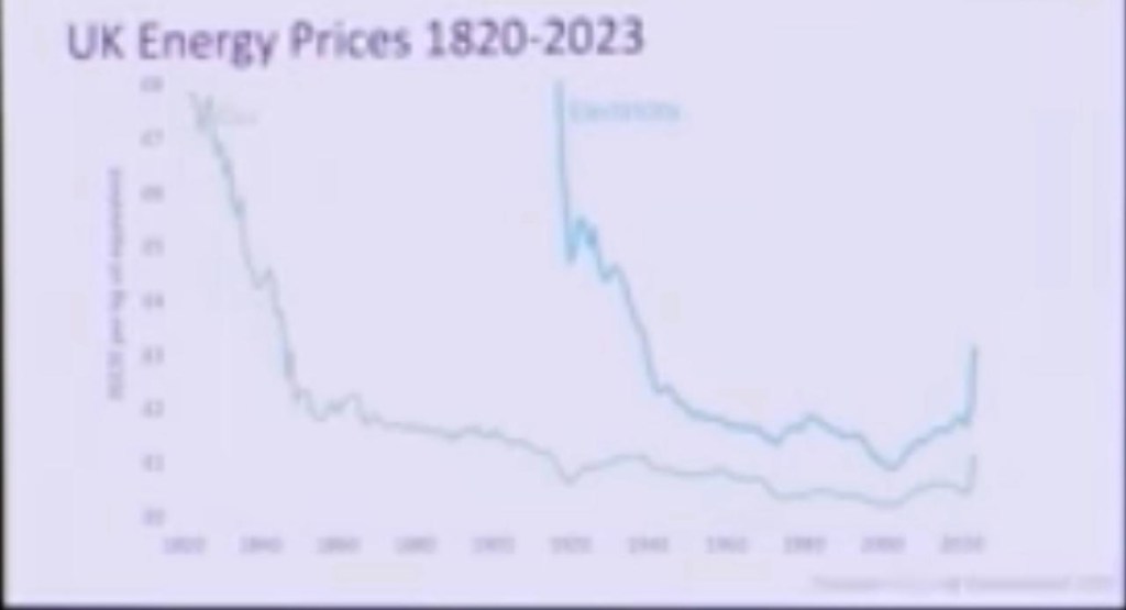Raramente falamos sobre o fato de que, ao criarmos cada vez mais políticas climáticas, isso também nos afeta negativamente e, na verdade, retira recursos de nós. Basta dar uma olhada nos preços da energia aqui no Reino Unido. Os preços da energia vêm caindo nos últimos dois séculos, mas agora estão começando a subir por causa da política climática. Portanto, se olharmos para o preço do gás, ele caiu por quase dois séculos e, nas últimas duas décadas, vem subindo, não apenas por causa das políticas climáticas, pois certamente também podemos ver a guerra na Ucrânia, mas também por causa da política climática.