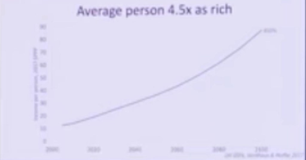 Essa é uma conquista fantástica e a mudança climática não vai prejudicar isso. O único economista do clima a ganhar o Prêmio Nobel de Economia do Clima, William Northaus, estima que, se não fizermos nada em relação ao clima, o que não é o que estou defendendo, se não fizermos nada em relação ao clima, isso significará que, em 2100, em vez de sermos 450% mais ricos, parecerá que seremos apenas 434% mais ricos. Sim, isso é um pouco menos ruim, um pouco menos bom mas ainda é uma conquista fantástica, apenas um progresso um pouco mais lento em nossa conquista aqui no planeta terra as coisas estão melhorando.