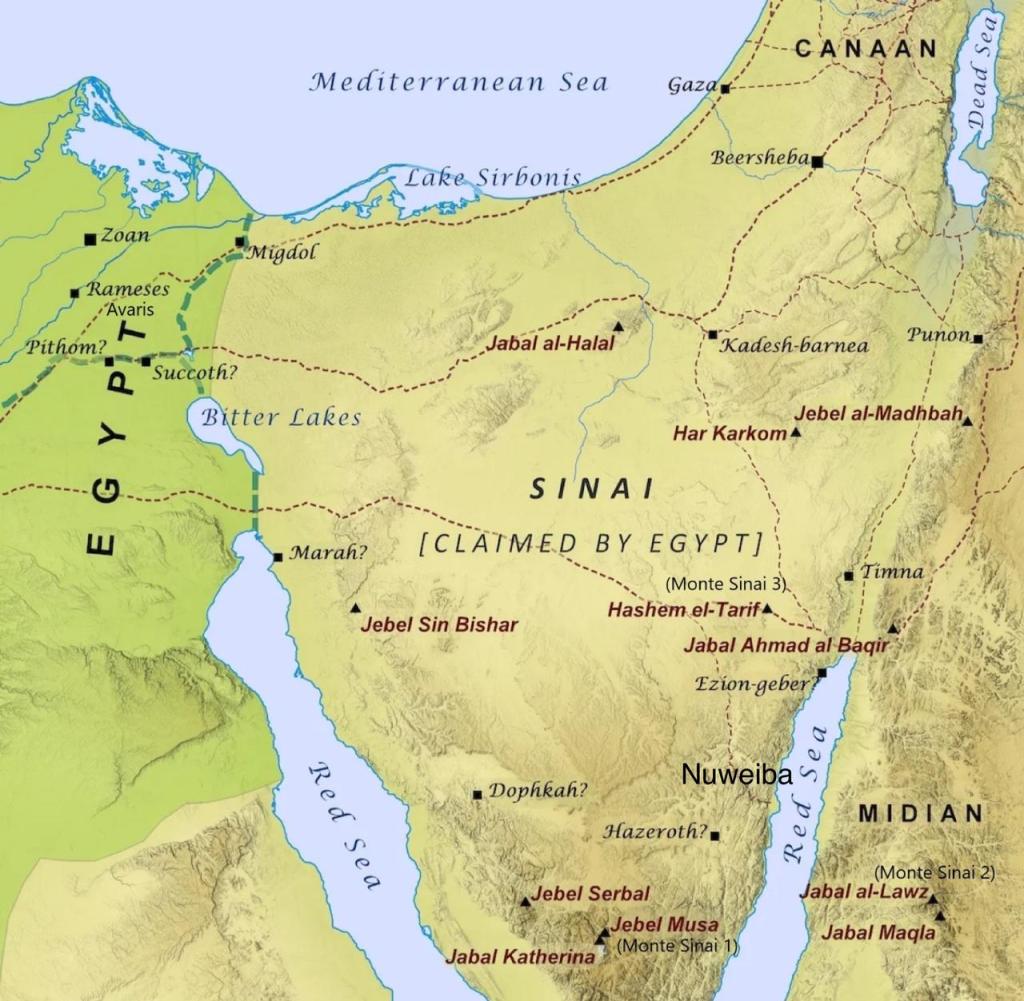Selecionei as 4 versões mais publicadas, nas quais existem 2 locais da travessia do mar e 3 locais onde estaria o Monte Sinai.