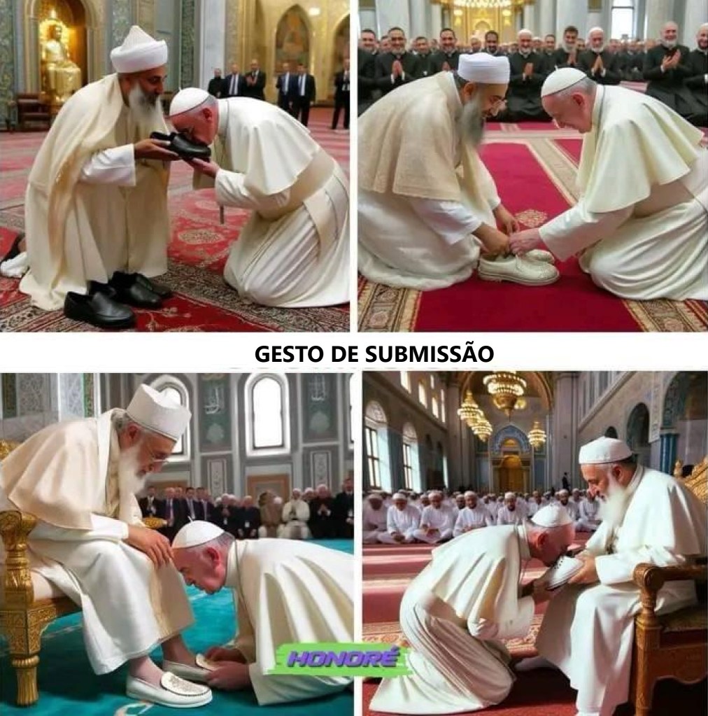 Já o Papa Francisco tem se humilhado muitas vezes ao prostrar-se aos pés de representantes do Islã, como pode ser visto na imagem acima. Esse gesto é visto pelos muçulmanos como um gesto de submissão e o usam para mostrar que o Sumo Pontífice da Igreja Católica reconhece que o Islã é a única religião verdadeira e incentiva os católicos a também se submeterem à agressiva religião de Maomé. Uma vergonha!