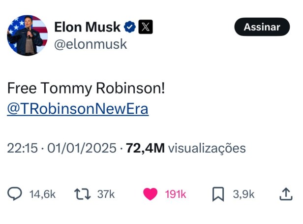 Elon Musk compartilhou o vídeo e até fez um tweet pedindo a liberdade de Tommy Robinson.