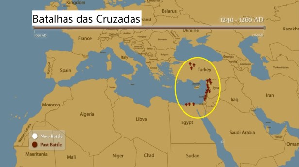 Então elas começam com os Cruzados entrando na Turquia até o Oriente Médio (Em 1.080 Depois de Cristo). Batalhas acontecem, mas em número bem menor do que pensavam que seria. Foram apenas 17 batalhas.