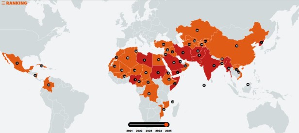 1;North Korea; 2.Somalia; 3.Yemen; 4.Libya; 5.Sudan; 6.Eritrea; 7.Nigeria; 8.Pakistan; 9.Iran; 10.Afghanistan; 11.India; 12.Saudi Arabia; 13.Myanmar; 14.Mali; 15.China; 16.Maldives; 17.Iraq; 18.Syria; 19.Algeria; 20.Burkina Faso; 21.Morocco; 22.Laos; 23.Mauritania; 24.Bangladesh; 25.Uzbekistan; 26.Cuba; 27.Central African Republic; 28.Niger; 29.Turkmenistan; 30.Nicaragua; 31.Mexico; 32.Oman; 33.Ethiopia; 34.Tunisia; 35.Congo DR (DRC); 36.Bhutan; 37.Mozambique; 38.Kazakhstan; 39.Tajikistan; 40.Egypt; 41.Qatar; 42.Comoros; 43.Cameroon; 44.Vietnam; 45.Türkiye; 46.Colombia; 47.Kyrgyzstan; 48.Brunei; 49.Chad; 50.Jordan.