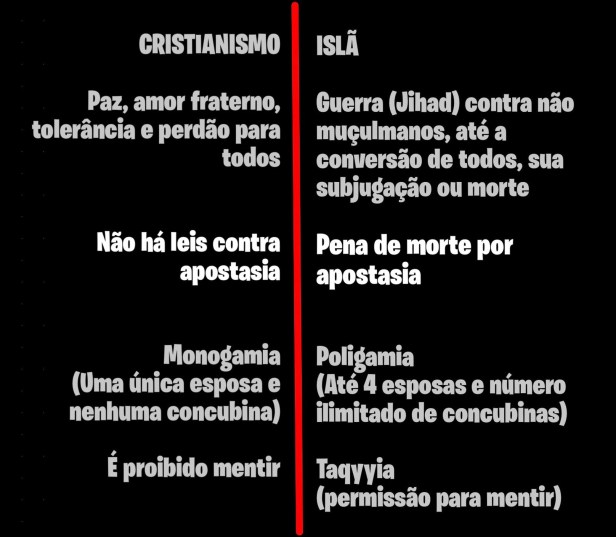 QUARTO: No cristianismo é proibido mentir em quaisquer circunstâncias, enquanto no Islã existem várias circunstâncias nas quais é permitido mentir. As mentiras ou dissimulações são chamadas de “Taqiyya”.