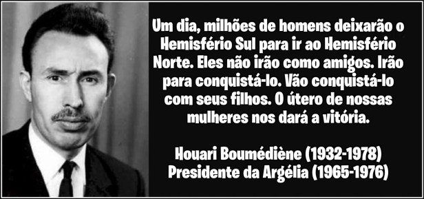 “Um dia, milhões de homens deixarão o Hemisfério Sul para ir ao Hemisfério Norte. Eles não irão como amigos. Irão para conquistá-lo. Vão conquistá-lo com seus filhos, porque o útero de nossas mulheres nos dará a vitória.” – Houari Boumédiènne – Presidente da Argélia (1965-1976)