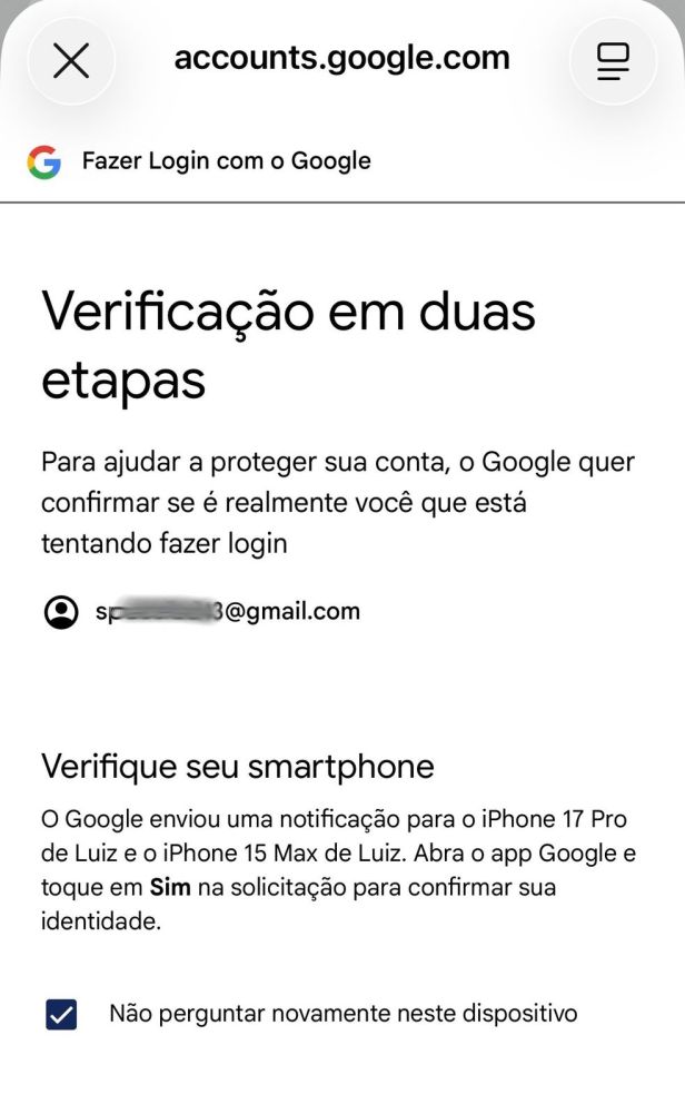 Fui acessar o gmail no iPhone e pediu para eu inserir a senha, o que fiz. Daí pediu para fazer a verificação em duas etapas e repetiu tudo outra vez. Fiz isso várias vezes e numa delas emitiu um código de 6 dígitos e pediu para eu inseri-lo no outro dispositivo. Só que no outro dispositivo não apareceu o lugar onde eu teria que inserir o código. Nem no Google, nem no e-mail, nem em qualquer lugar que eu soubesse.