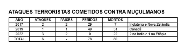 No mesmo período foram registrados apenas alguns ataque específicos contra muçulmanos, como mostrado na tabela a seguir.