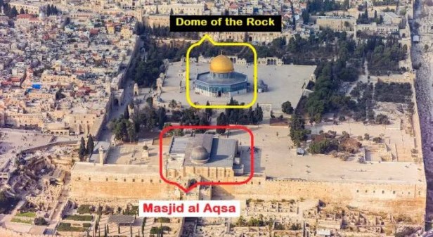 A Mesquita Al Aqsa e o Domo da Rocha. Lembre que foram construídos especificamente de forma a olhar para baixo, para o Santo Sepulcro. Essas construções específicas foram construídas por um califa no final do século 8. E as inscrições ao redor deles são todas hostis, especialmente ao cristianismo. Então, ao redor do Domo da Rocha, que fica bem ao lado da Mesquita Al Aqsa, há todos esses versos do Corão dizendo: